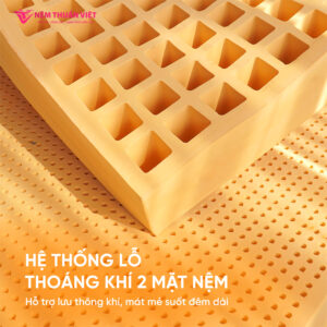 Cao su tự nhiên cấu trúc tế bào mở với hệ thống lỗ thoát khí ở cả hai bề mặt 5000 lỗ tròn thông khí nhỏ phía trên bề mặt nệm cùng 500 lỗ vuông thông hơi lớn phía dưới sẽ giúp quá trình lưu thông không khí diễn ra liên tục điều hòa thân nhiệt đồng thời loại bỏ độ ẩm từ mồ hôi để đem lại cho bạn cảm giác thư thái và tận hưởng giấc ngủ trọn vẹn nhất.