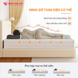 Nệm cao su Thuần Việt Latex sở hữu lõi cao su nguyên khối với độ bền, độ đàn hồi và tuổi thọ đạt chuẩn mang lại khả năng nâng cho đường cong cơ thể người nằm một cách vừa vặn, giúp bạn giảm thiểu tình trạng đau lưng hay đau mỏi vai gáy. Nhờ đó, tư thế nằm luôn được giữ thẳng và bảo vệ theo cấu tạo tự nhiên giúp cho cơ thể thoải mái trong mọi tư thế nằm. Bạn sẽ cảm nhận được ngay sự dễ chịu và thoải mái trên tấm nệm chỉ từ lần đầu trải nghiệm. Nệm không chỉ tương thích với mọi vị trí nằm mà còn giúp giảm thiểu áp lực từ các điểm tiếp xúc để bạn có một giấc ngủ không bị gián đoạn và thức dậy tràn đầy năng lượng.